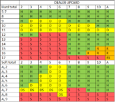 A blackjack strategy chart is a color-coded guide that shows when players should hit, stand, split, double down or surrender, based on the player’s score and the dealer’s upcard. Running along the left side are the player’s hands, and the dealer’s upcard runs across the top. Punters just need to scan down and find the best action for each hand. For instance, if a player has a hard 14 and the dealer’s upcard is a 7, the chart shows the best play is to hit.
